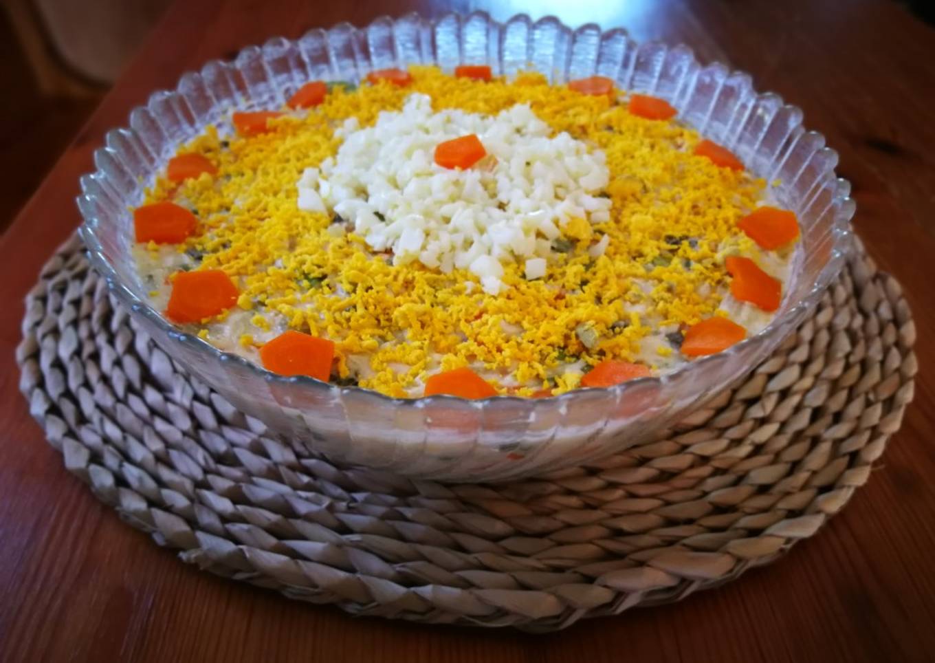 - Picar las claras de huevo y rallar las yemas sobre la ensalada. Decorar con la clara y la zanahoria reservada. Tapar con film transparente y guardar en la nevera para 4 horas.