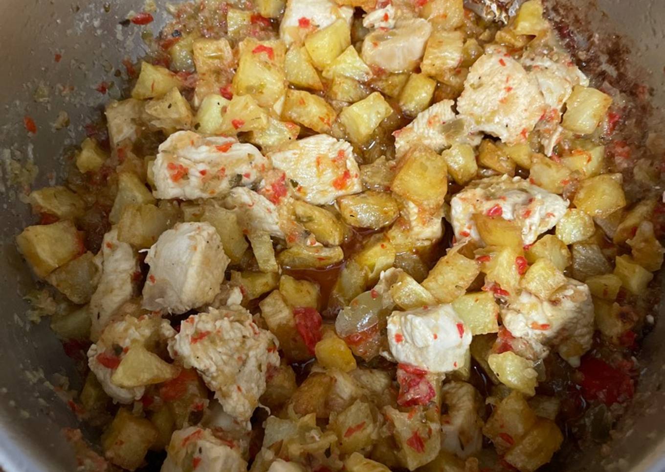 - Las papas las dejamos que estén doraditas y cuando estén las sacamos y la ponemos directamente en el caldero donde tenemos las pechugas y removemos todo junto y listo
