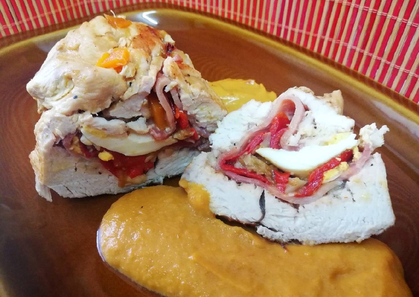 Esta receta nos encanta por lo sencilla y resultona que es. Es un éxito asegurado, digno de una ocasión especial. Podemos rellenar la pechuga con nuestros ingredientes preferidos, aquí os traigo esta propuesta que suele gustar a todos, pero también podemos añadir espinacas, nueces, etc. Imaginación al poder. Guisada en una deliciosa salsa de cebolla, zanahorias y vino, el resultado es una carne súper jugosa con una riquísima explosión de sabores. Empecemos.
