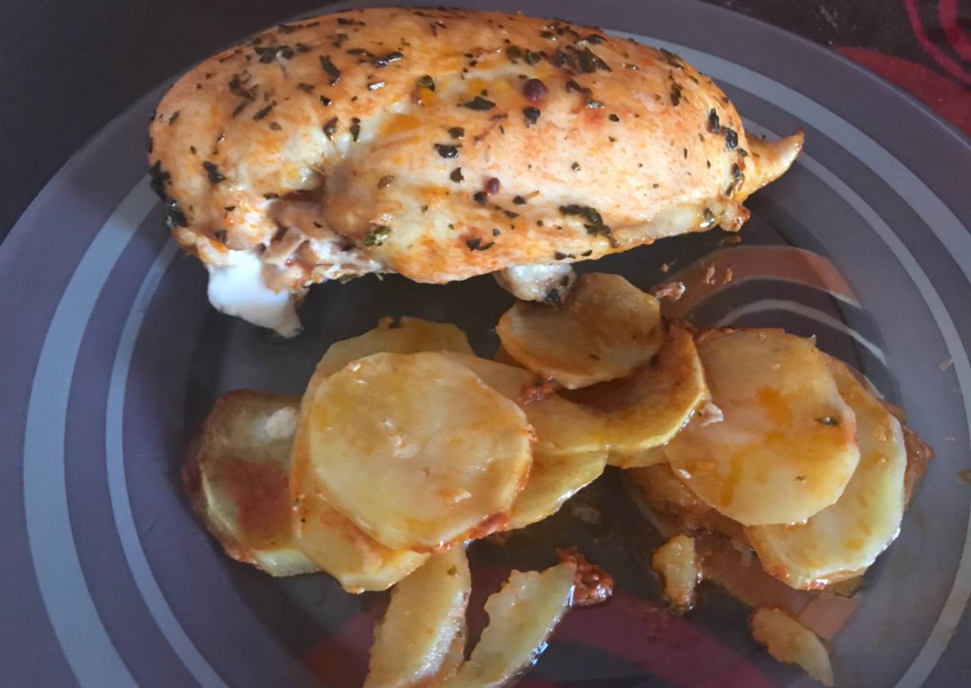 - Una vez pasado los 20 minutos sacamos el recipiente del horno y ponemos encima de la patata y echamos por encima todo el mejunje que quedó donde estaba la pechuga, la metemos en el horno otros 20 minutos y solo queda una cosa......