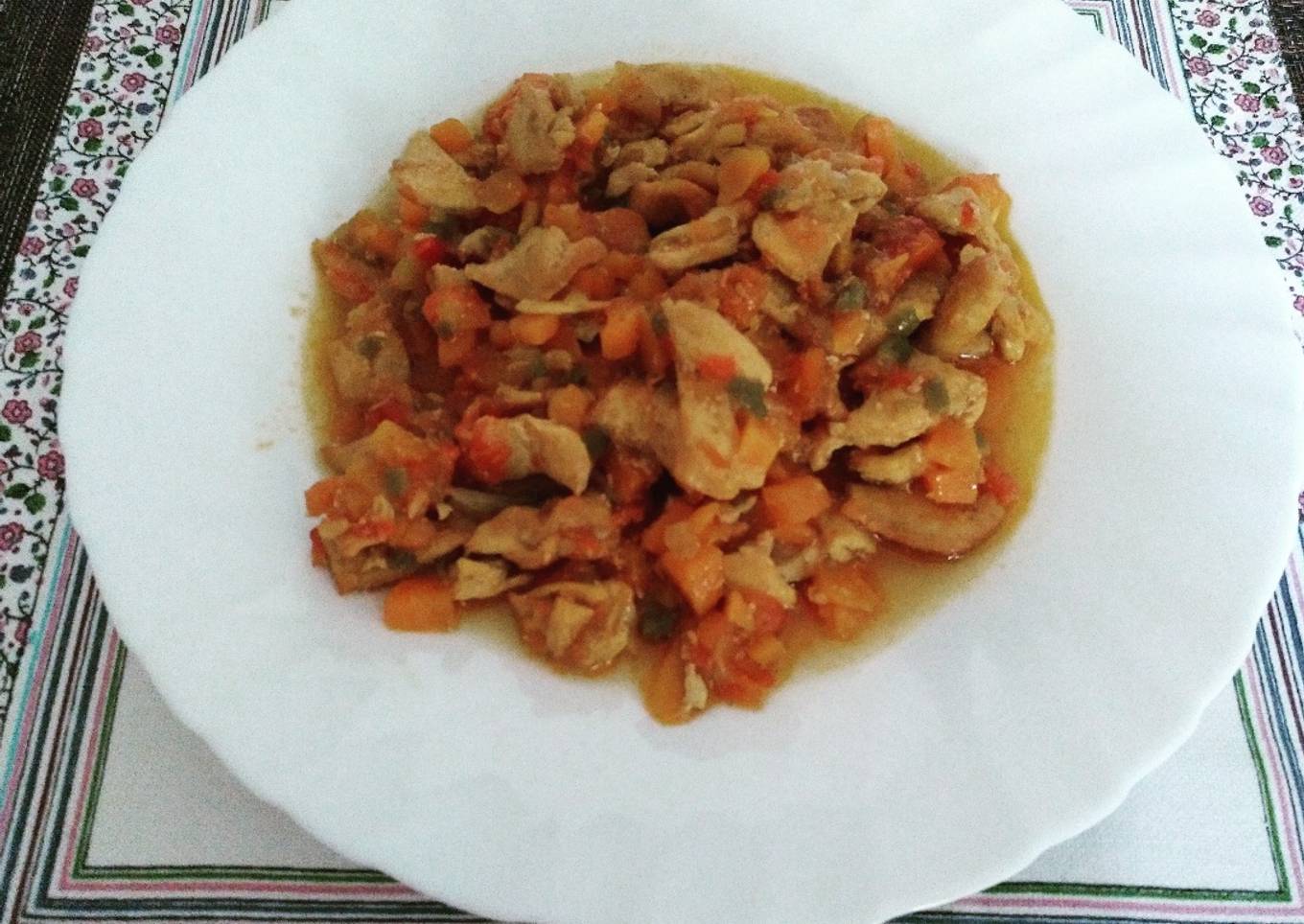 - Las pechugas se cortan a trocitos, se incorporan a la sartén se doran, se reservan a continuaciónen ese mismo aceite echamos el tomate, la cebolleta, el pimiento y la zanahoria, todo muy picadito.